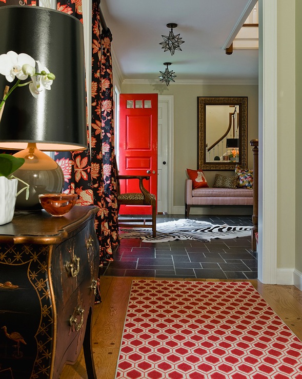 In this home pattern is even cohesively mixed throughout the home – and the exterior! Red – in both large and small doses is the “thread” that creates the cohesion.