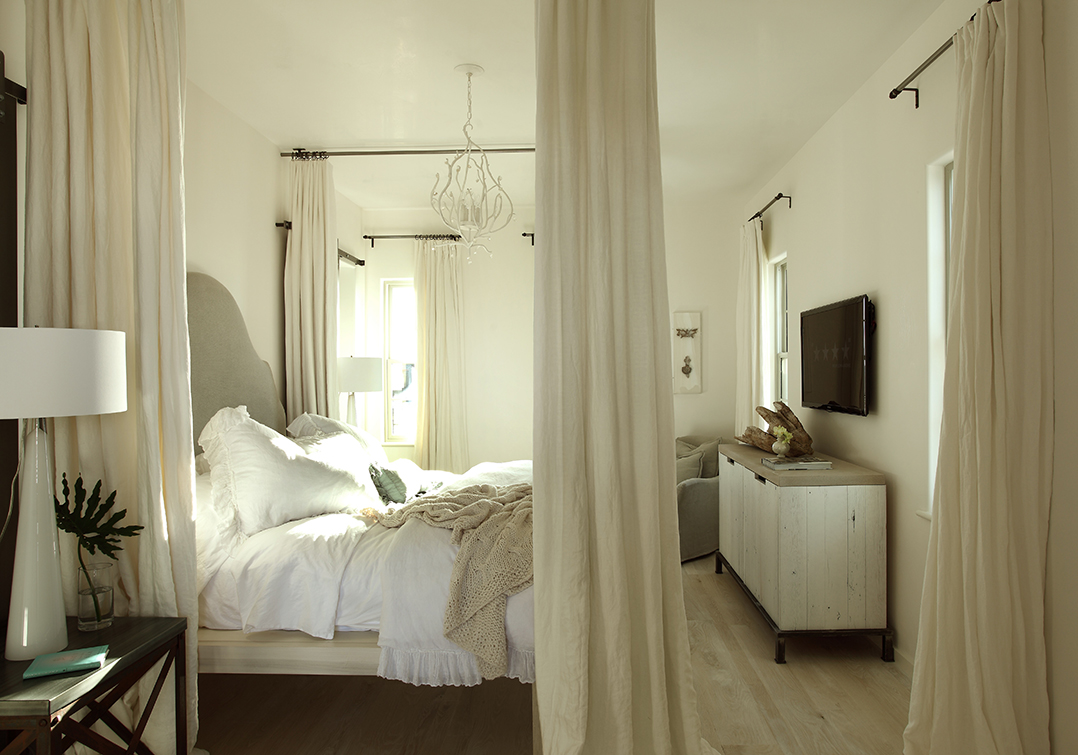 This beach house bedroom is light and airy. The linen curtains allow ocean breezes through the space.